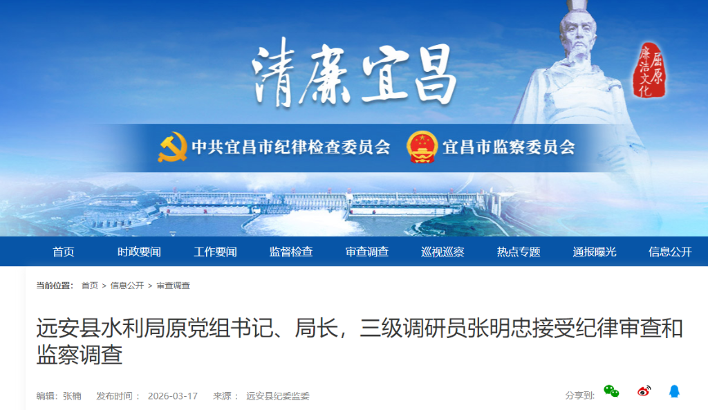 据宜昌市远安县纪委监委消息:远安县水利局原党组书记、局长,三级调研员张明忠涉嫌严重违纪违法,目前正接受宜昌市远安县纪委监委纪律审查和监察调查。