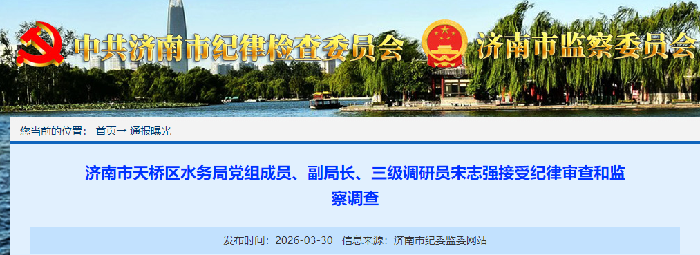 据天桥区纪委监委消息:济南市天桥区水务局党组成员、副局长、三级调研员宋志强涉嫌严重违纪违法,主动投案,目前正接受济南市天桥区纪委监委纪律审查和监察调查。