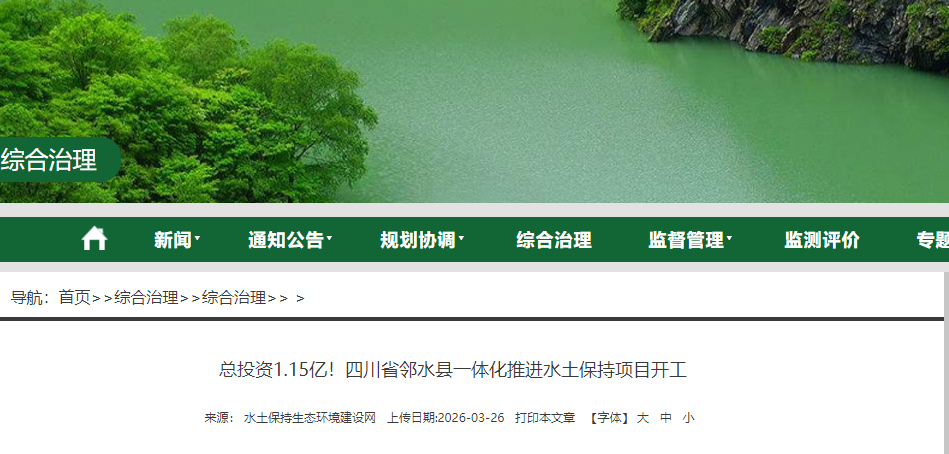 3月20日,四川省邻水县一体化推进水土保持工程正式开工建设。项目总投资1.15亿元,其中中央资金8000万元,地方资金3500万元。工程覆盖丰禾、袁市等6个乡镇65个村,治理水土流失面积60.57平方公里,惠及群众11.86万人。项目主要实施坡面水土流失综合治理、沟(河)道及湖库周边整治等工程,工期2年,项目计划于2027年12月全面竣工。