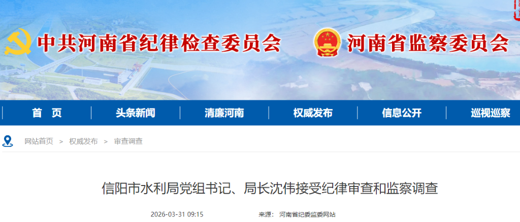 据信阳市纪委监委消息:信阳市水利局党组书记、局长沈伟涉嫌严重违纪违法,目前正接受信阳市纪委监委纪律审查和监察调查。