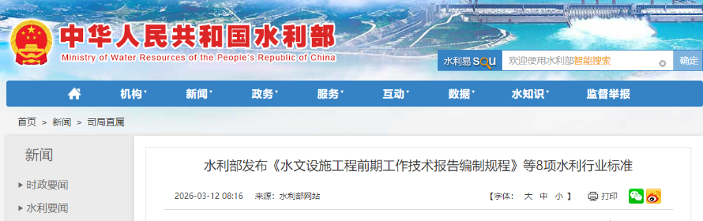 本站讯 近日,水利部发布2026年第3号公告,批准发布《水文设施工程前期工作技术报告编制规程》等8项水利行业标准。相关标准将于2026年5月11日起实施。