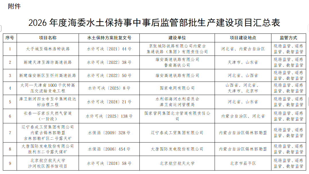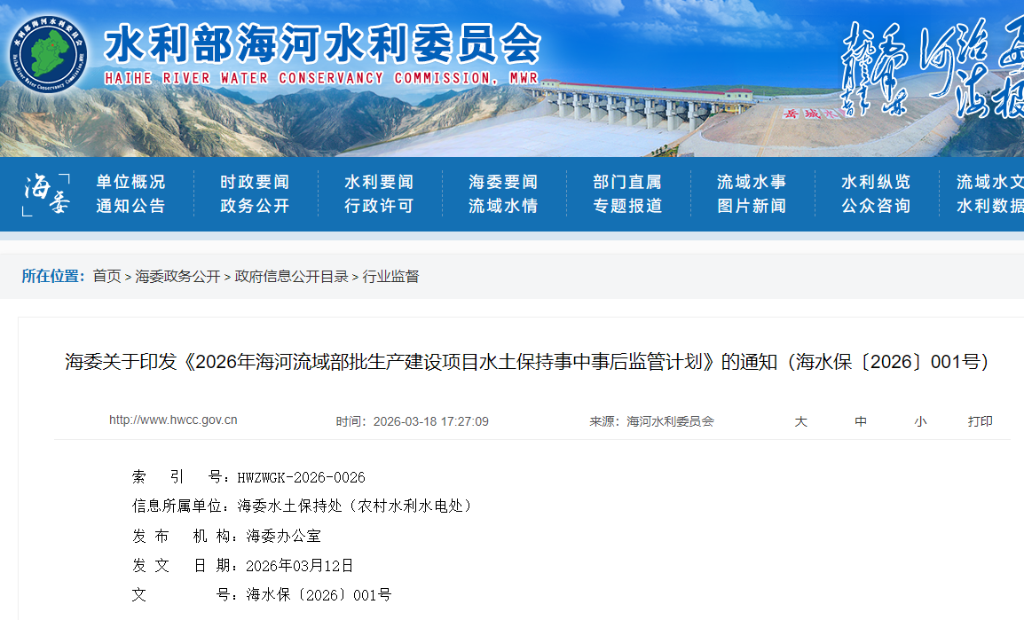 海委关于印发《2026年海河流域部批生产建设项目水土保持事中事后监管计划》的通知