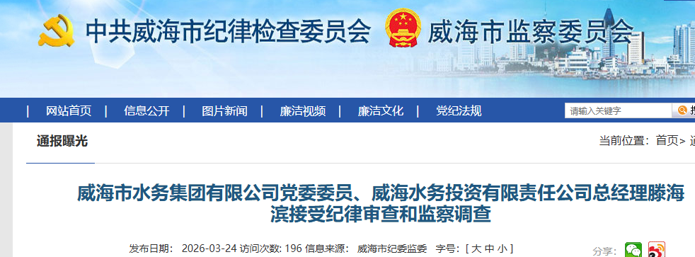 威海市水务集团有限公司党委委员、威海水务投资有限责任公司总经理滕海滨涉嫌严重违纪违法,目前正接受威海市纪委监委纪律审查和监察调查。