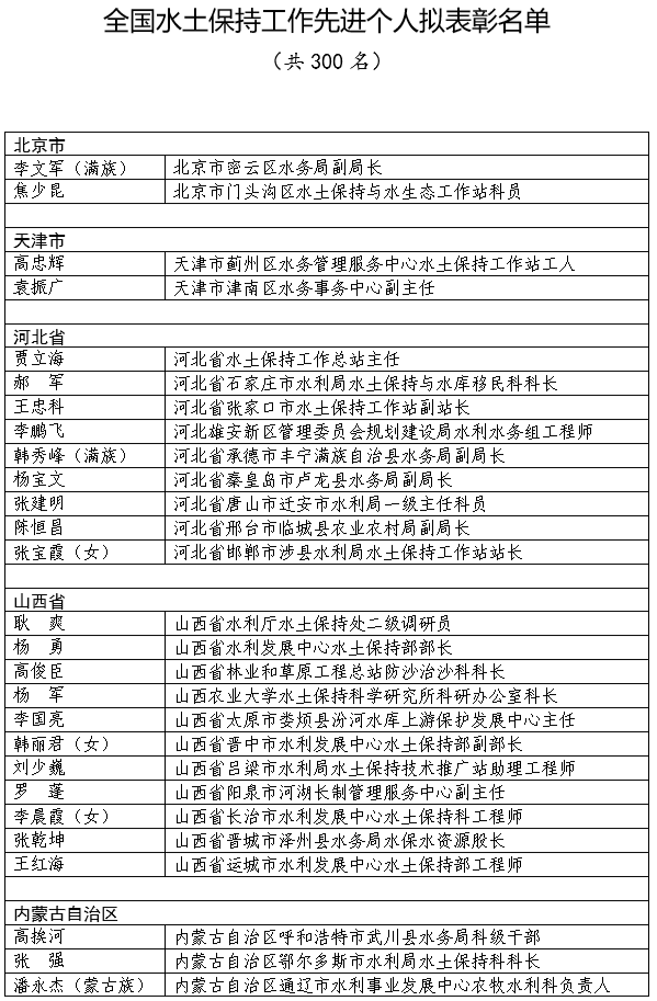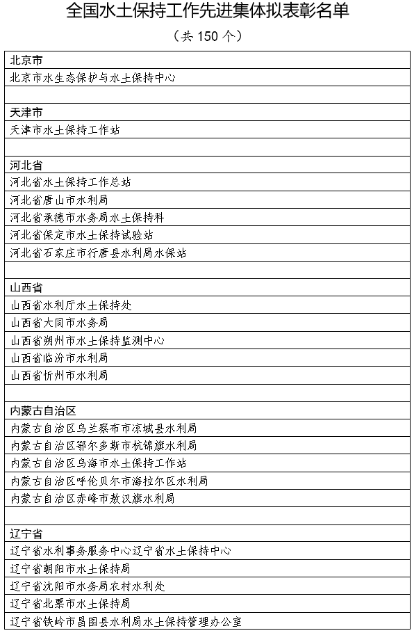 根据《水利部关于开展全国水土保持工作先进集体和先进个人评选表彰活动的通知》(水人事函〔2022〕75号),按照公开、公平、公正的原则,经逐级推荐评选,征求有关方面意见,并经水利部评审,拟表彰150个全国水土保持工作先进集体、300名全国水土保持工作先进个人(名单附后)。为充分发扬民主,广泛听取意见,现将拟表彰名单进行公示。