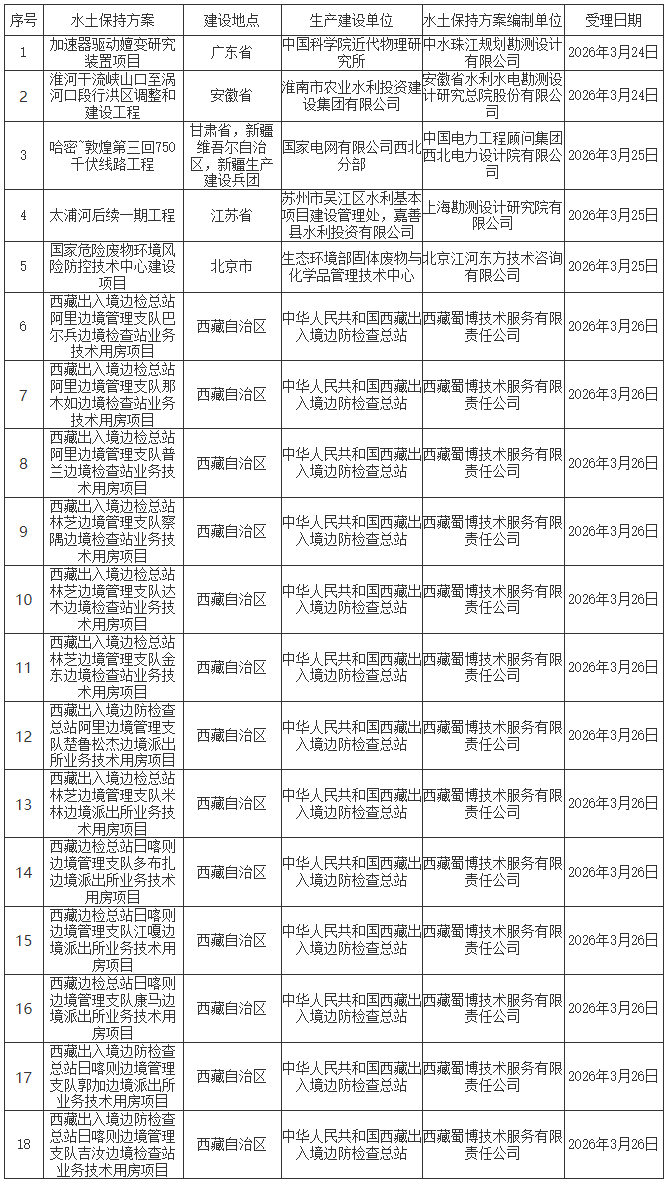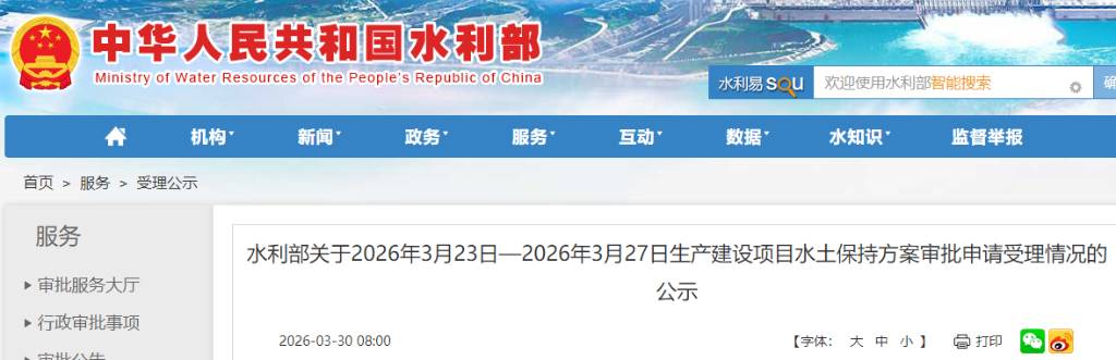 根据水土保持法、行政许可法及生产建设项目水土保持方案管理的有关规定,2026年3月23日—2026年3月27日我部共受理了20个项目水土保持方案审批申请。现将受理情况予以公示,公示期限2026年3月30日—2026年4月10日。