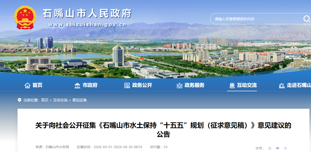 为深入贯彻习近平生态文明思想,依据《中华人民共和国水土保持法》等有关规定,我局组织编制了《石嘴山市水土保持“十五五”规划(征求意见稿)》。现向社会公开征求意见。
