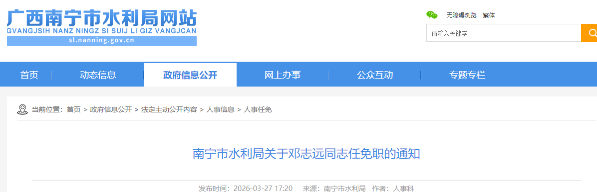 邓志远同志任南宁市水利局规划财务科副科长(负责主持全面工作),免去其南宁市水利局水利工程建设科(科学技术科)副科长职务。
