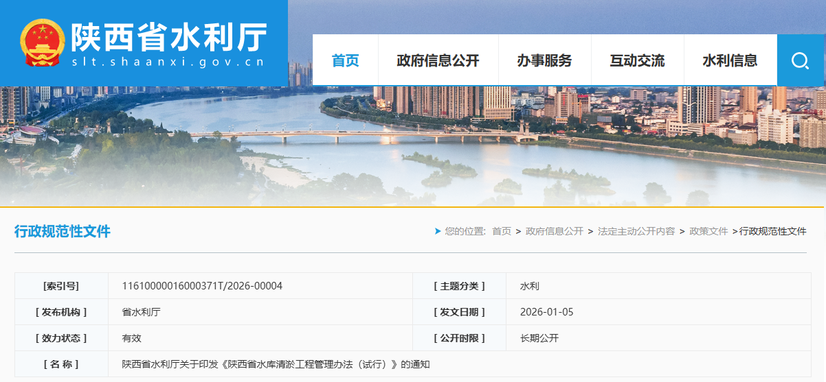为规范全省水库清淤项目建设,加强水库库容管理,保障水库防洪安全和运行达效,省水利厅制定了《陕西省水库清淤工程管理办法(试行)》,经2025年8月25日第5次厅务会审议通过,现予以印发,请遵照执行。