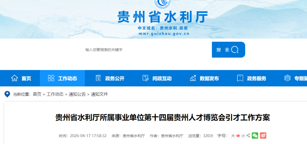在贵州省人力资源和社会保障厅官网(http://rst.guizhou.gov.cn/)、贵州省水利厅官网(http://mwr.guizhou.gov.cn)发布引才公告。公告时间从2026年4月20日到2026年4月28日。