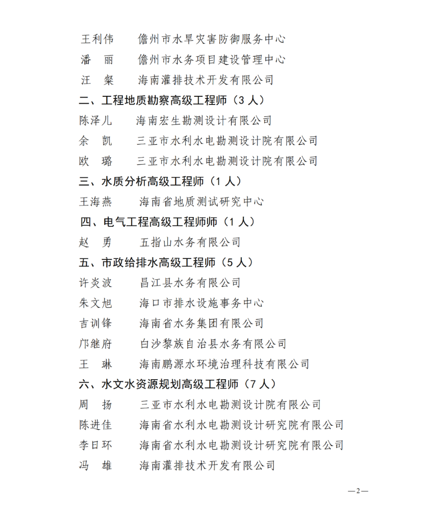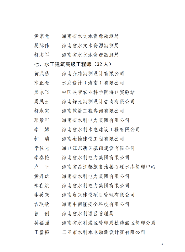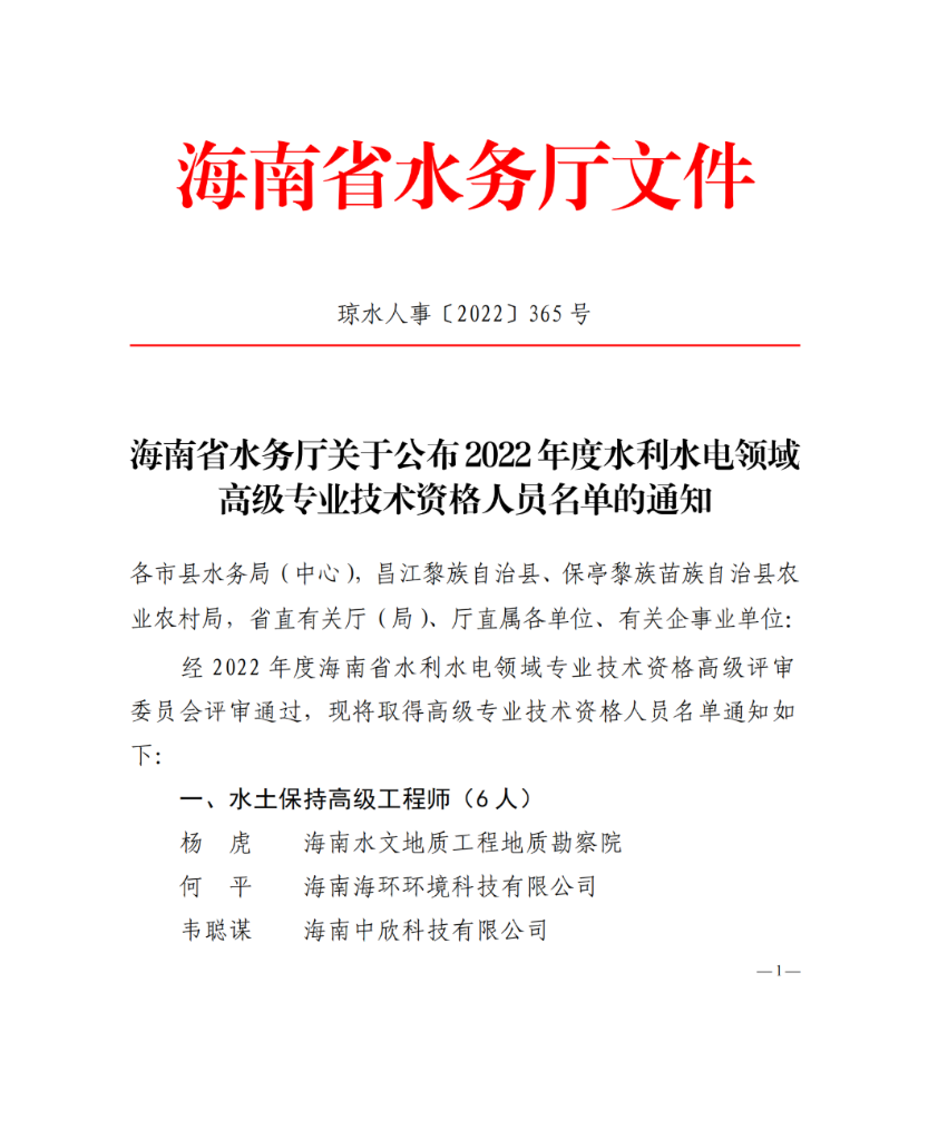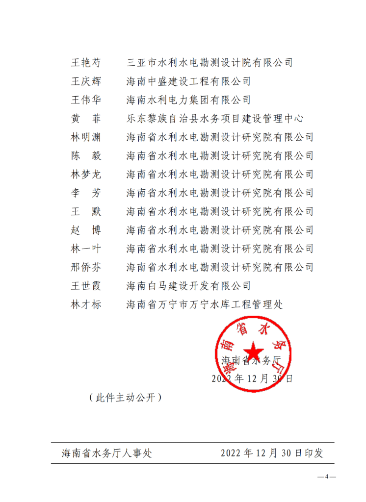海南省水务厅关于公布2022年度水利水电领域高级专业技术资格人员名单的通知