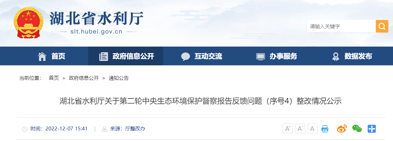 根据湖北省委、省政府生态环境保护督察工作领导小组《关于印发〈湖北省贯彻落实中央生态环境保护督察整改工作办法的具体措施(试行)〉的通知》(鄂环督〔2022〕8号)关于整改验收销号工作的安排,现将省水利厅第二轮中央生态环境保护督察报告反馈问题(序号4)整改情况公示如下: