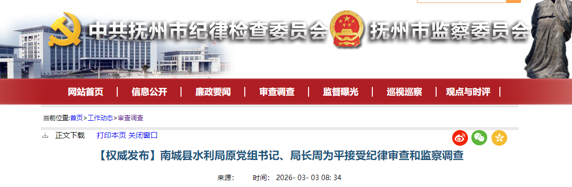 1、据抚州市纪委监委3月3日消息:南城县水利局原党组书记、局长