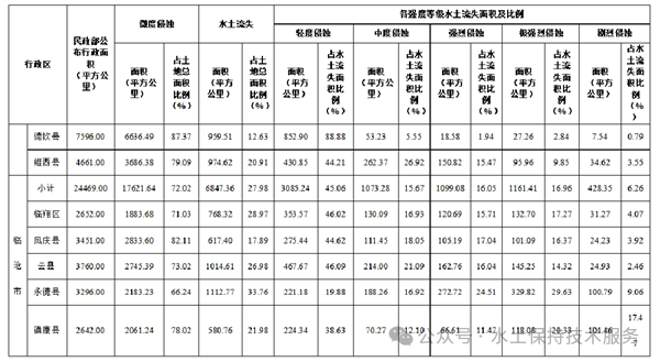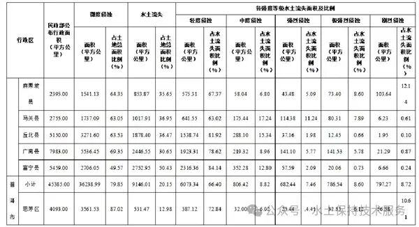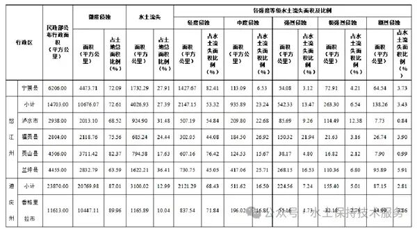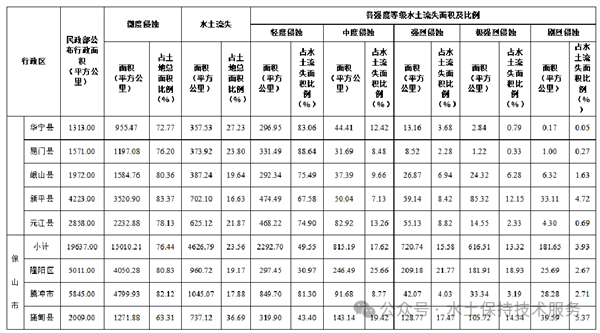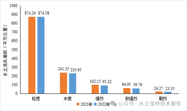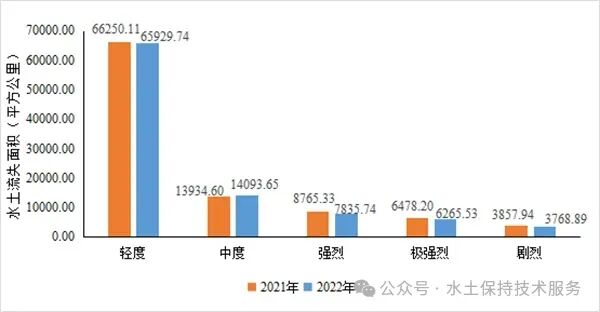 2022年全省水土流失总面积较2021年减少1392.63平方公里,减幅1.40%。其中,轻度侵蚀面积减少320.37平方公里,中度侵蚀面积增加159.05平方公里,强烈侵蚀面积减少929.59平方公里,极强烈侵蚀面积减少212.67平方公里,剧烈侵蚀面积减少89.05平方公里。