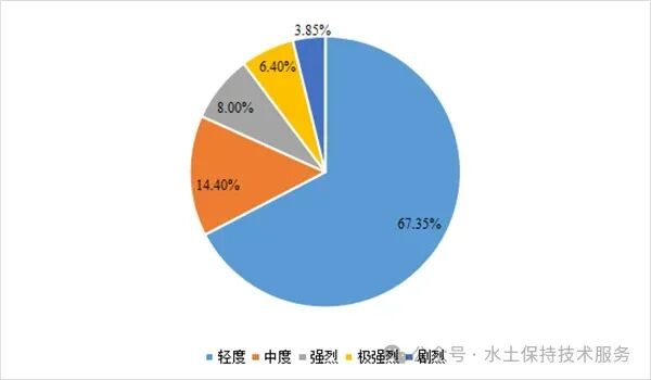 土壤侵蚀是指在水力、风力、冻融、重力等自然营力和人类活动作用下,土壤或其他地面组成物质被破坏、剥蚀、搬运和沉积的过程。土壤侵蚀强度是指以单位面积和单位时段内发生的土壤侵蚀量为指标划分的土壤侵蚀等级。按侵蚀强度分,轻度、中度、强烈、极强烈、剧烈侵蚀面积分别为65929.74平方公里、14093.65平方公里、7835.74平方公里、6265.53平方公里、3768.89平方公里,分别占全省水土流失总面积的67.35%、14.40%、8.00%、6.40%、3.85%。