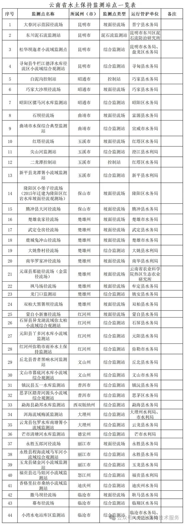 云南省共有水土保持监测站点44个,基本构建了覆盖全省16个州(市)、全国水土保持区划、水土流失防治区、六大流域、九大高原湖泊的水土保持监测站网。