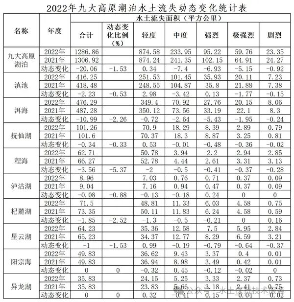 2022年全省九大高原湖泊水土流失面积较2021年减少20.06平方公里,减幅1.53%。其中,轻度侵蚀面积增加0.34平方公里,中度侵蚀面积减少7.40平方公里,强烈侵蚀面积减少6.93平方公里,极强烈侵蚀面积减少5.15平方公里,剧烈侵蚀面积减少0.92平方公里。