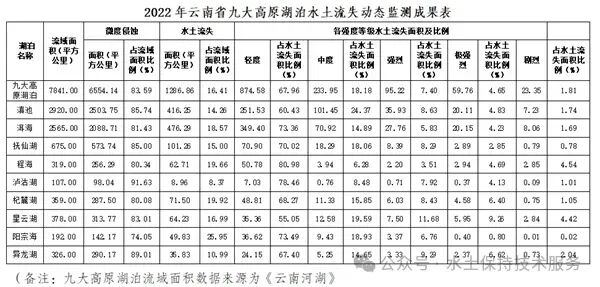 2022年,云南省九大高原湖泊水土流失面积1286.86平方公里,占其流域面积7841平方公里的16.41%。按侵蚀强度分,轻度、中度、强烈、极强烈、剧烈侵蚀面积分别为874.58平方公里、233.95平方公里、95.22平方公里、59.76平方公里、23.35平方公里,分别占其水土流失总面积的67.96%、18.18%、7.40%、4.65%、1.81%。