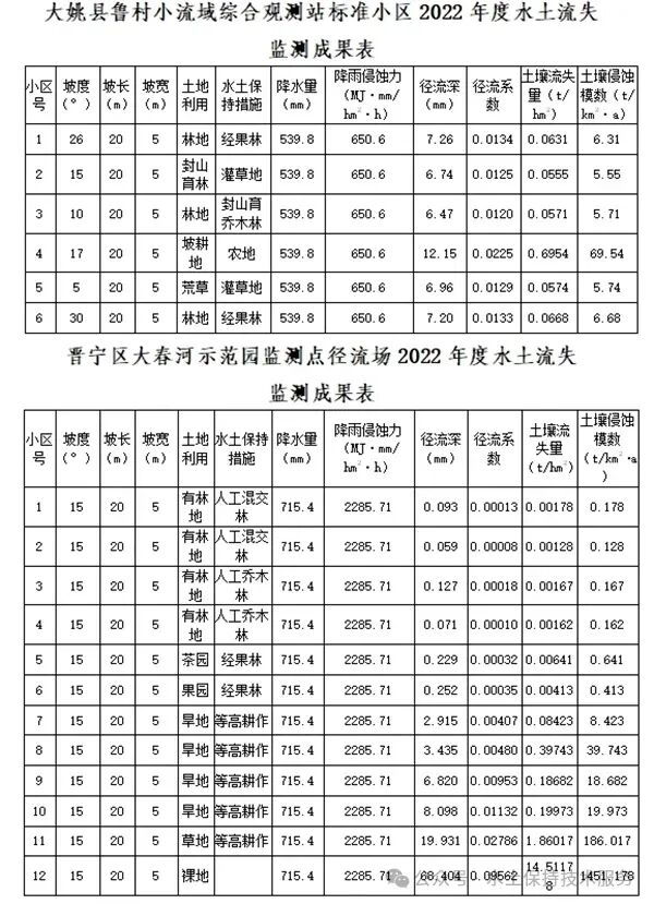 云南省大姚县鲁村监测点、晋宁区大春河示范园监测点列入全国水土流失动态监测与公告项目。按照该项目的管理规定和技术要求,2022年度监测成果如下: