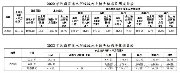 2022年,云南省赤水河流域水土流失面积1042.71平方公里,占其土地总面积2044.93平方公里的50.99%。按侵蚀强度分,轻度、中度、强烈、极强烈、剧烈侵蚀面积分别为638.27平方公里、174.04平方公里、101.50平方公里、102.05平方公里、26.85平方公里,分别占其水土流失总面积的61.21%、16.69%、9.73%、9.79%、2.58%。与2021年相比,水土流失面积减少13.62平方公里,减幅1.29%。
