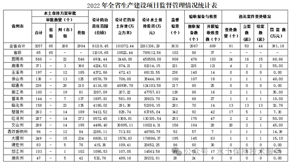 2022年,云南省生产建设项目水土保持信息化监管工作稳步推进,全面完成全省新审批的3257个生产建设项目水土保持方案、省级审批的220个在建生产建设项目水土保持监测季报、102个生产建设项目水土保持监督执法检查意见、84个生产建设项目监测总结报告及水土保持设施自主验收报告等相关数据的录入工作。