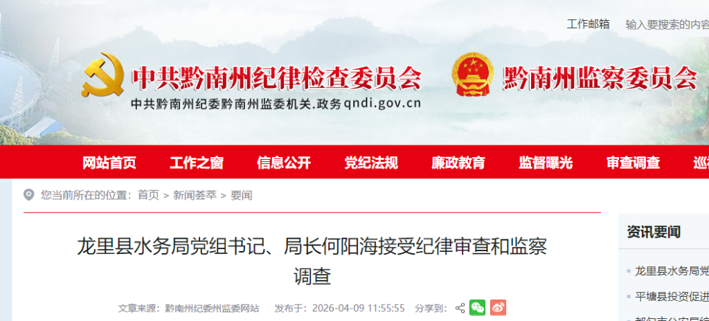 龙里县水务局党组书记、局长何阳海涉嫌严重违纪违法,目前正接受龙里县纪委监委纪律审查和监察调查。(龙里县纪委监委)