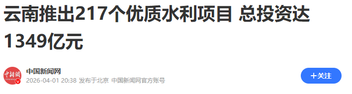 中新网昆明4月1日电 (李海燕 刘姿琳)近日,2026年云南省水利招商引资项目推介会暨“政银企”合作座谈会在昆明市举行,集中推出5大类217个优质水利项目,总投资达1349亿元。