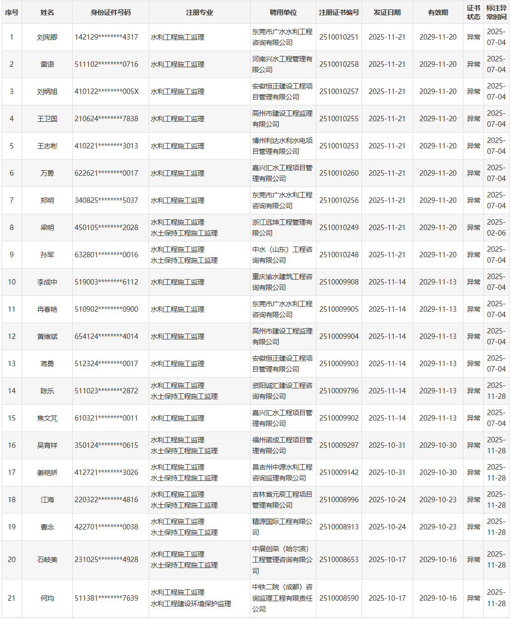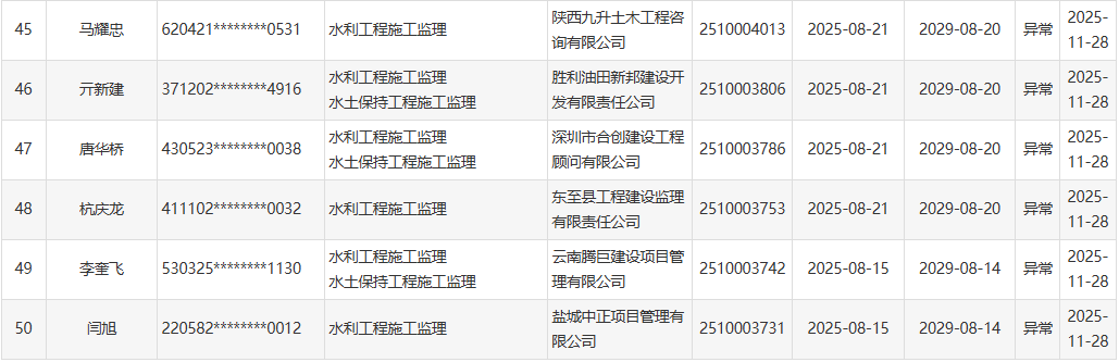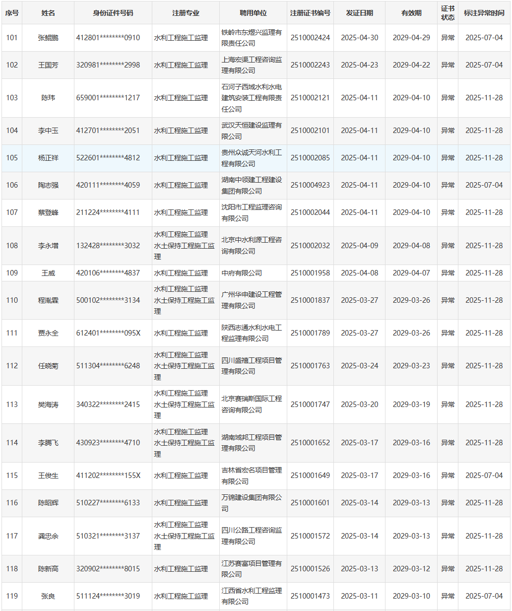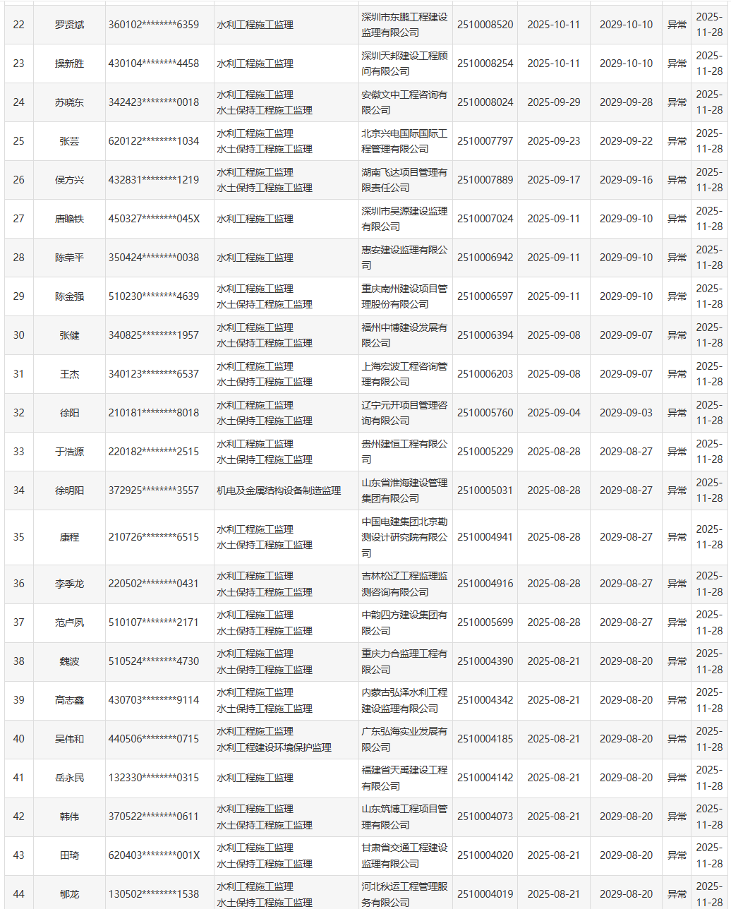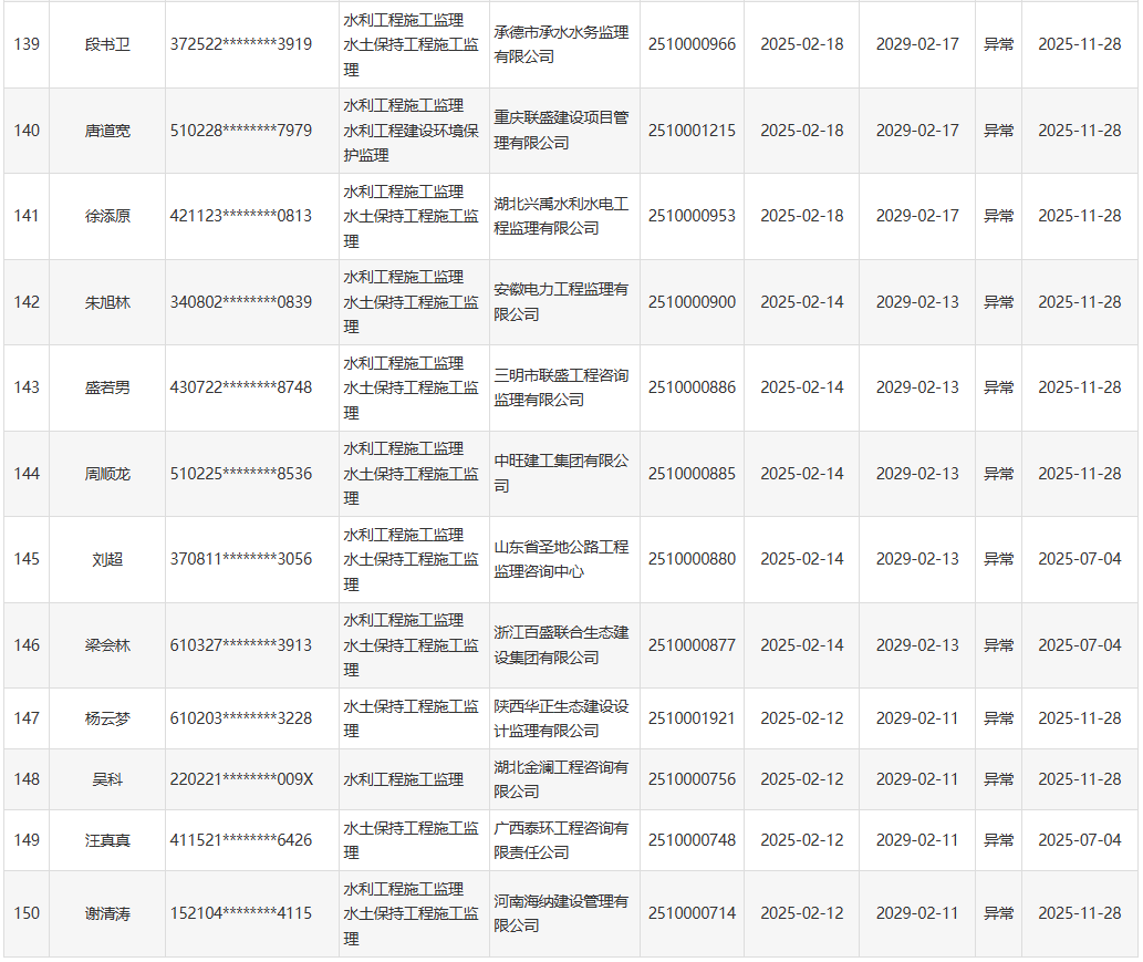根据《水利部办公厅关于开展一级造价工程师(水利工程)和监理工程师(水利工程)执业活动动态核查工作的通知》(办建设函〔2025〕726号),水利部于近期开展了一级造价工程师(水利工程)、监理工程师(水利工程)执业活动动态核查,发现部分人员在其他单位注册其他职业资格或者缴纳社会保险。