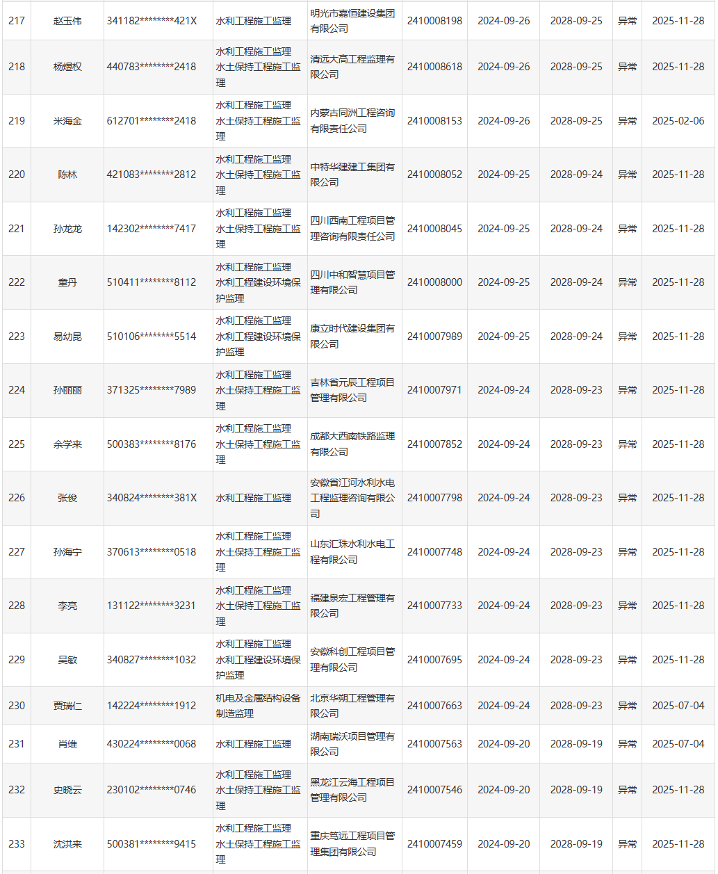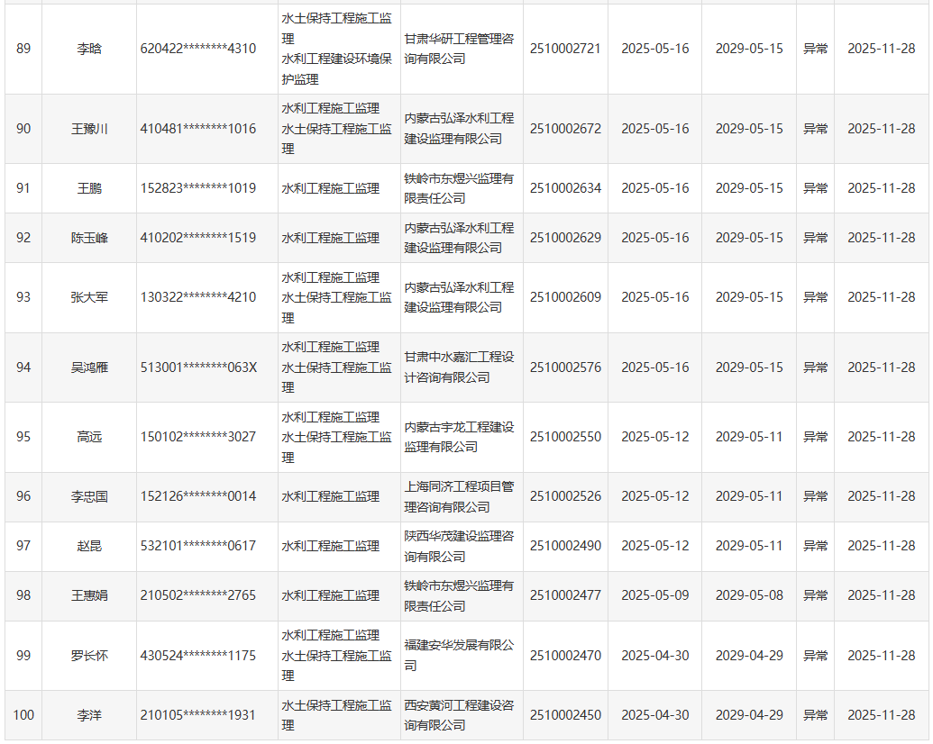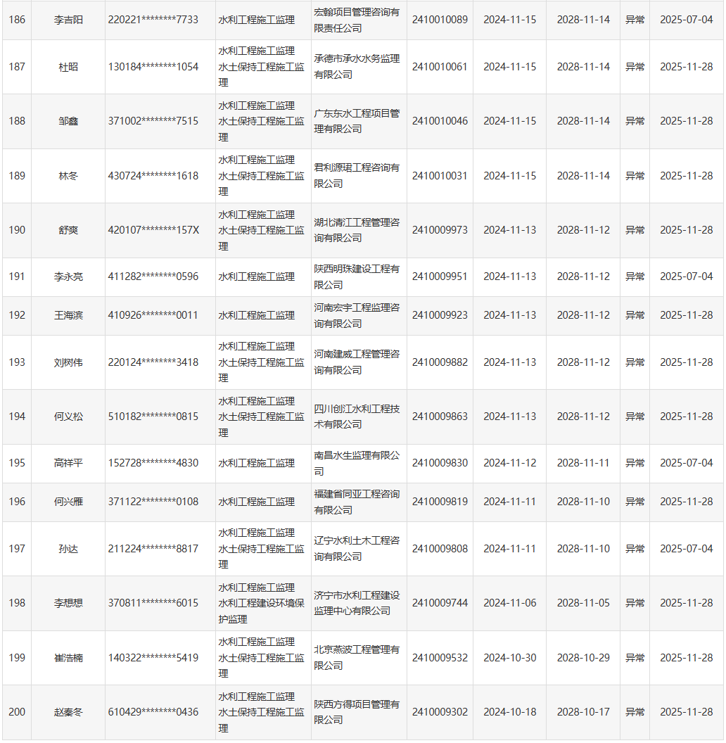 根据《水利部办公厅关于开展一级造价工程师(水利工程)和监理工程师(水利工程)执业活动动态核查工作的通知》(办建设函〔2025〕726号),水利部于近期开展了一级造价工程师(水利工程)、监理工程师(水利工程)执业活动动态核查,发现部分人员在其他单位注册其他职业资格或者缴纳社会保险。