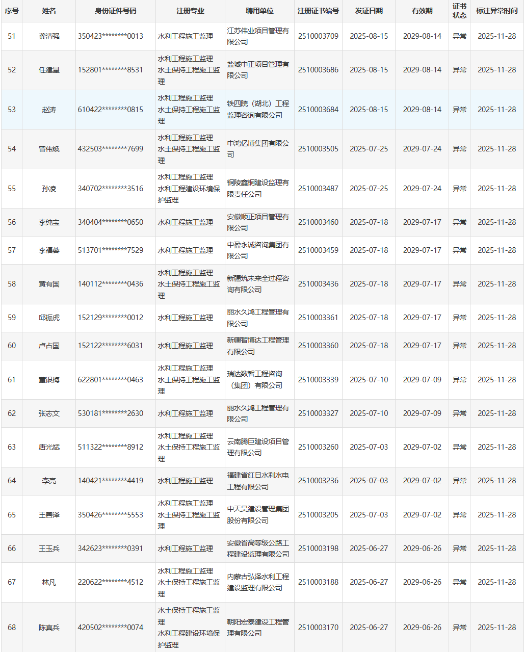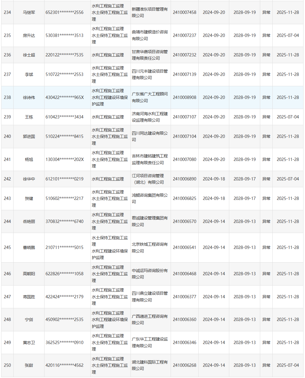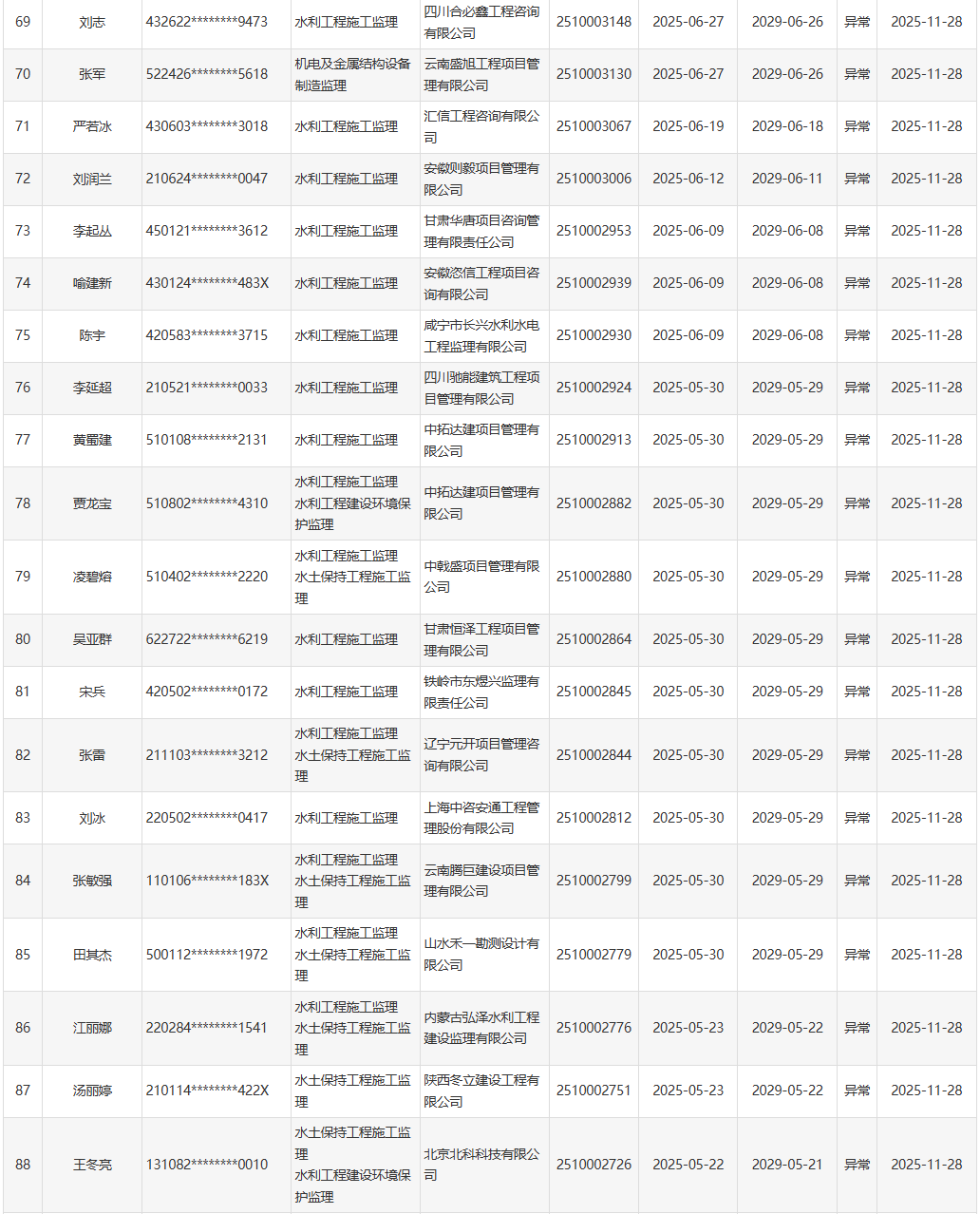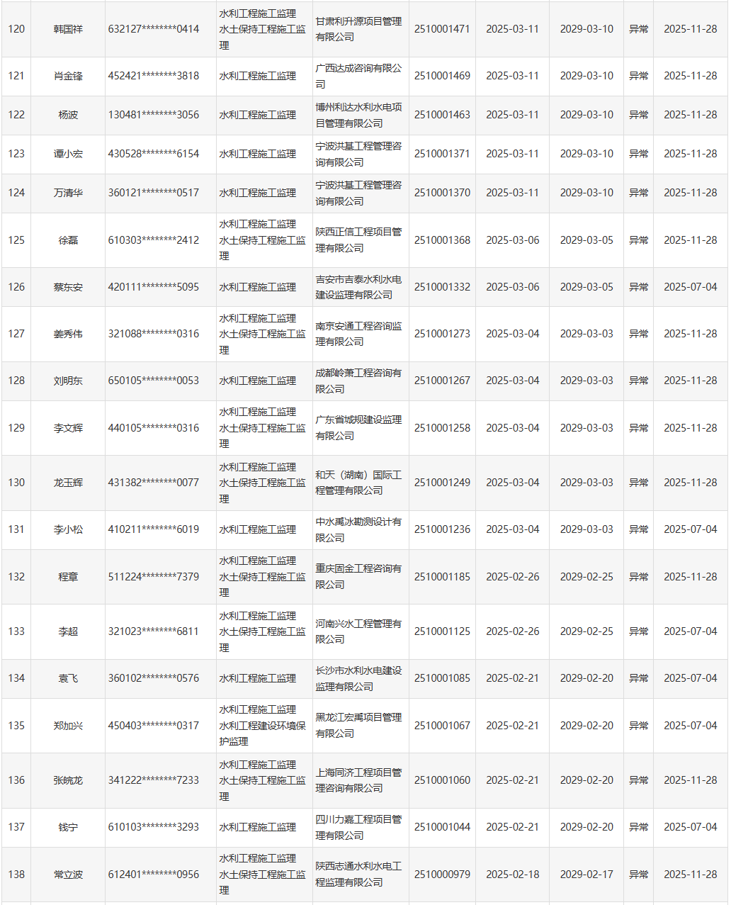 根据《水利部办公厅关于开展一级造价工程师(水利工程)和监理工程师(水利工程)执业活动动态核查工作的通知》(办建设函〔2025〕726号),水利部于近期开展了一级造价工程师(水利工程)、监理工程师(水利工程)执业活动动态核查,发现部分人员在其他单位注册其他职业资格或者缴纳社会保险。