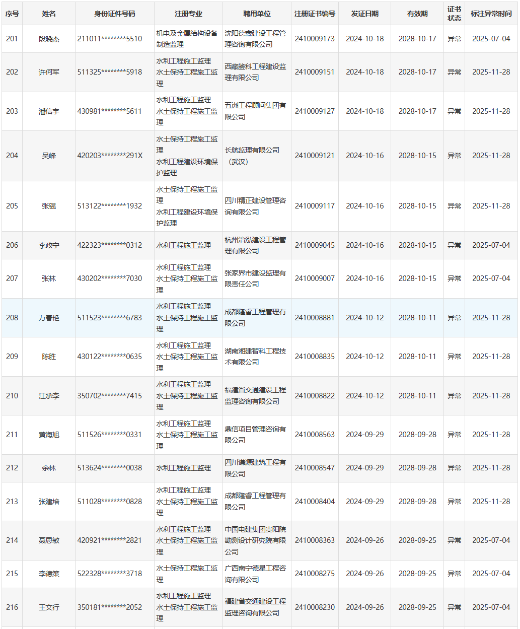 现将相关人员的注册证书状态设置为异常,并在水利部政务服务平台的“一级造价工程师(水利工程)注册信息查询”(https://spjc.mwr.gov.cn/spjc/hallg/seacher_zjs.jsp?mindex=2&state=1)和“监理工程师(水利工程)注册信息查询”(https://spjc.mwr.gov.cn/spjc/hallg/seacher_jlgcs.jsp?mindex=2&state=1)栏目予以公示。通过水利部政务服务平台系统消息和手机短信通知相关人员。