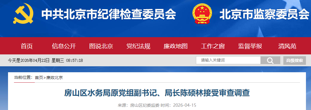 北京市房山区水务局原党组副书记、局长陈硕林涉嫌严重违纪违法,目前正接受房山区纪委监委纪律审查和监察调查。