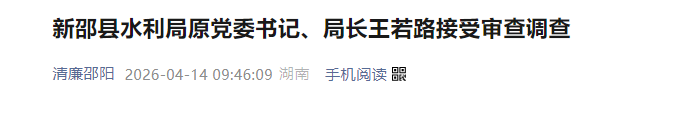 新邵县水利局原党委书记、局长、四级调研员王若路涉嫌严重违纪违法,主动向组织交代问题,目前正接受新邵县纪委监委纪律审查和监察调查。