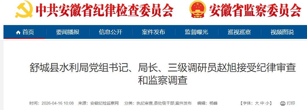 舒城县水利局党组书记、局长、三级调研员赵旭涉嫌严重违纪违法,目前正接受舒城县纪委监委纪律审查和监察调查。(舒城县纪委监委)