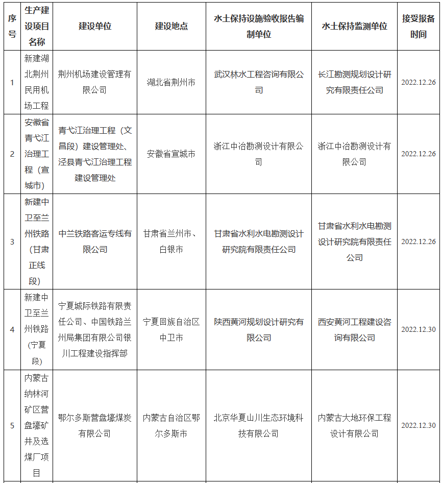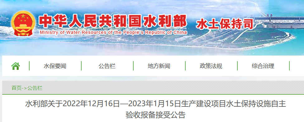 根据《国务院关于取消一批行政许可事项的决定》(国发〔2017〕46号)《水利部关于加强事中事后监管规范生产建设项目水土保持设施自主验收的通知》(水保〔2017〕365号)《水利部办公厅关于印发生产建设项目水土保持监督管理办法的通知》(办水保〔2019〕172号)有关规定,2022年12月16日—2023年1月15日我部接受了10个生产建设项目水土保持设施自主验收的报备。现予以公告,公告期2023年1月15日—2023年1月22日。