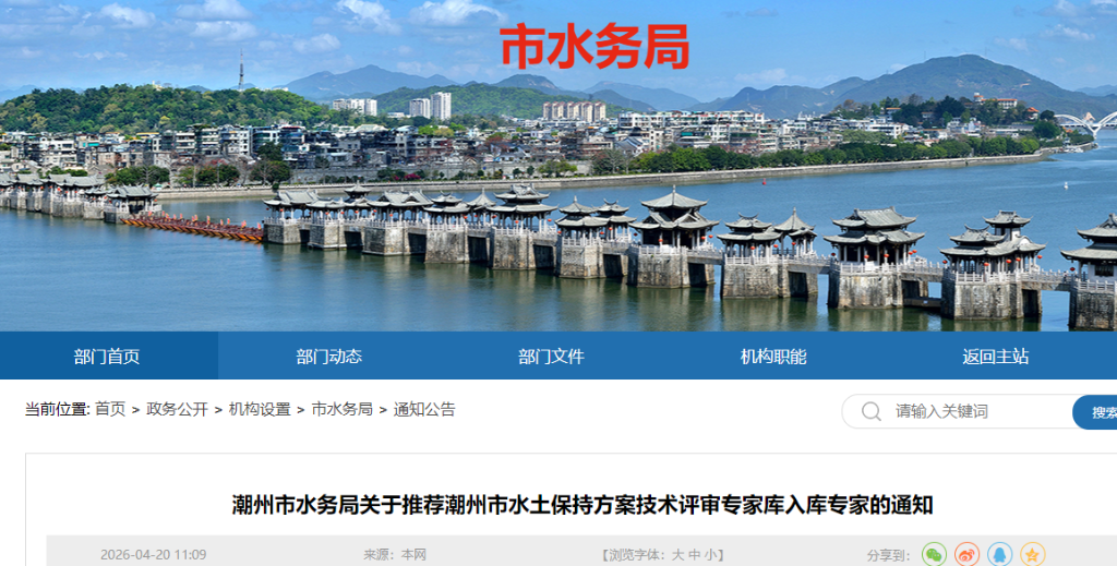 为进一步加强和规范我市生产建设项目水土保持方案技术评审的管理,充分发挥水土保持行业专家决策辅助作用,夯实技术支撑基础,不断提升水土保持方案审查质量,根据《广东省水利厅关于公布省水利厅综合专家库水土保持方案技术评审专家分库入库专家名单的通知》(粤水水保函〔2026〕172号)、《广东省水利厅关于进一步加强生产建设项目水土保持方案质量管理的通知》(粤水水保函〔2024〕1526号)中有关要求,现公开征集潮州市水土保持方案技术评审专家库入库专家。请各单位认真做好专家推荐工作,积极发动符合条件的人员申报入库。现就有关事项通知如下: