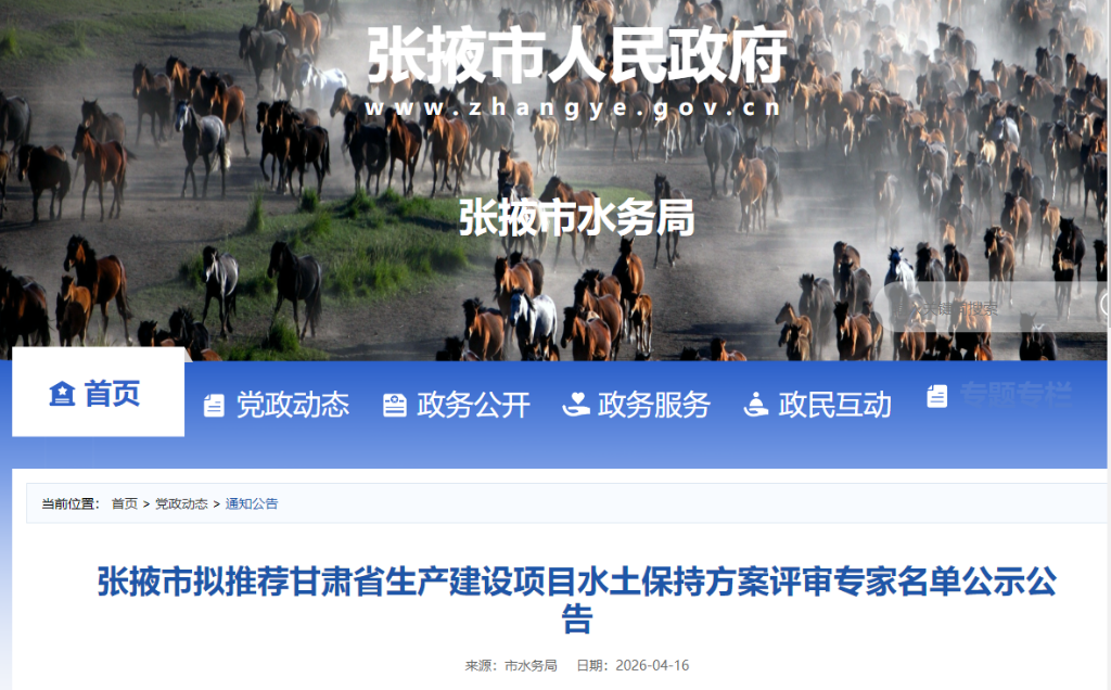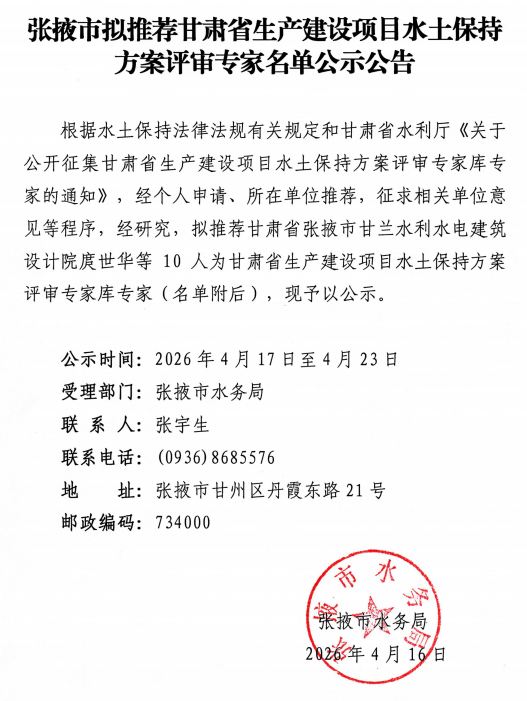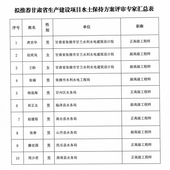 张掖市拟推荐甘肃省生产建设项目水土保持方案评审专家名单公示公告