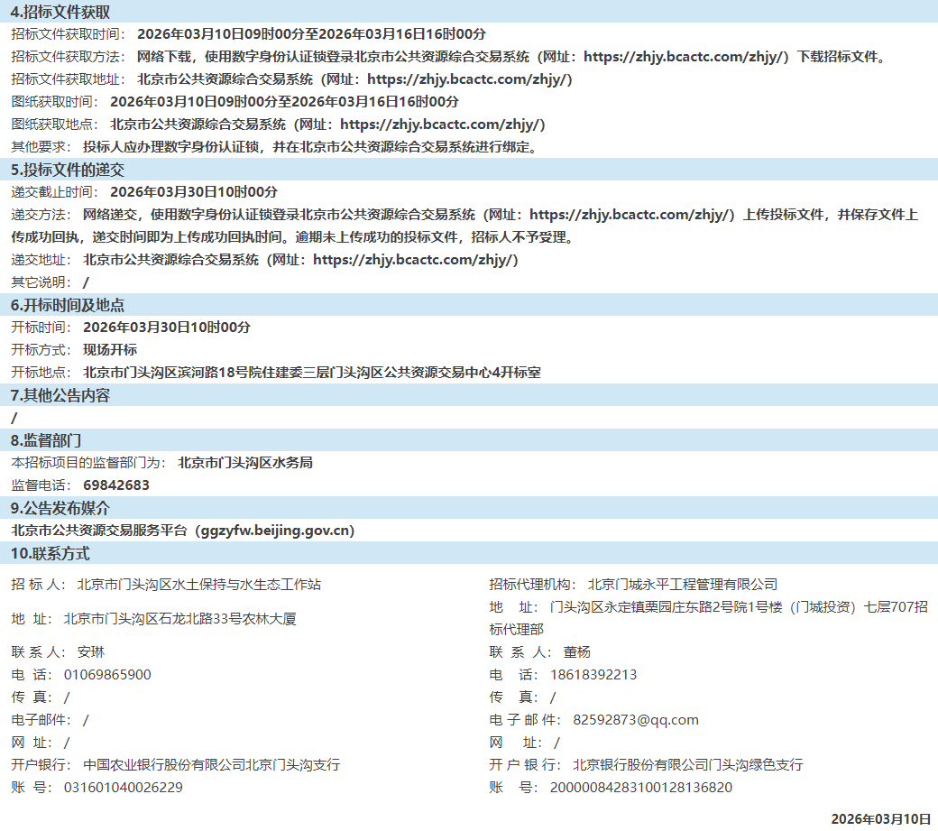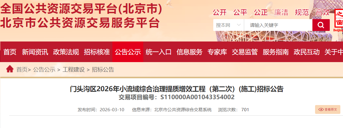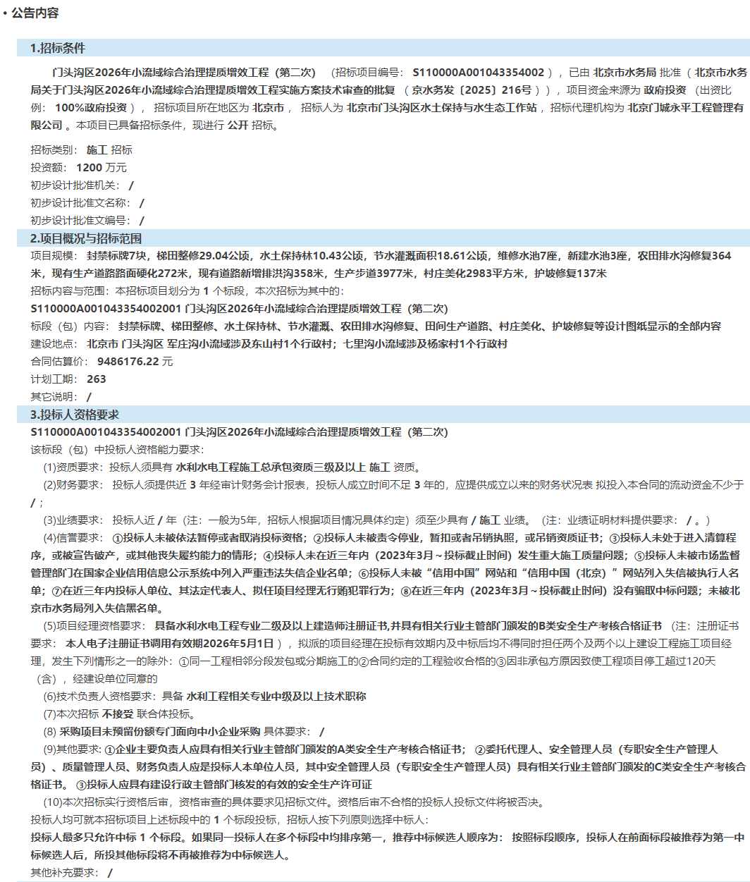 门头沟区2026年小流域综合治理提质增效工程(第二次)(施工)招标公告