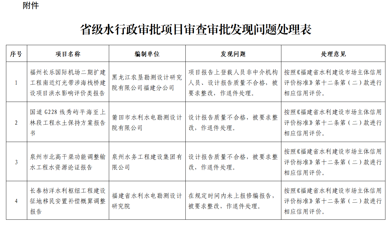 你们公司分别编制报审的《福州长乐国际机场二期扩建工程南近灯光带涉海栈桥建设项目洪水影响评价类报告》《国道G228线秀屿平海至上林段工程水土保持方案报告书》《泉州市北高干渠功能调整输水工程水资源论证报告》《长泰枋洋水利枢纽工程建设征地移民安置补偿概算调整报告》因审查审批过程中存在质量问题(详见附件),被退件处理。按照《福建省水利厅关于加强省级水行政审批事项质量管理工作的通知》(闽水函〔2021〕788号)要求,请你们公司进行认真整改,并与“福建省水利建设市场信用评价平台”主动对接。