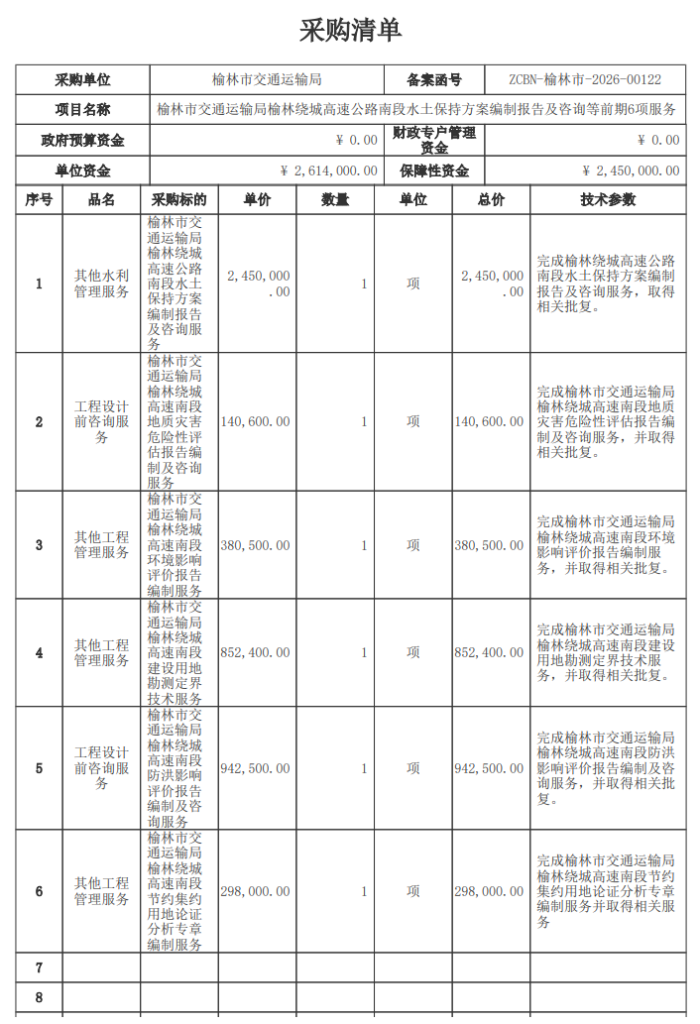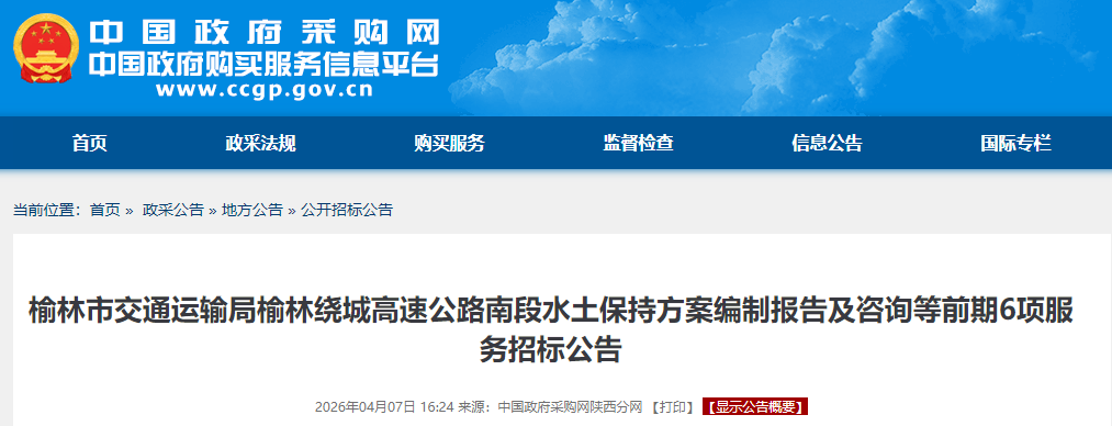 项目概况榆林绕城高速公路南段水土保持方案编制报告及咨询等前期6项服务招标项目的潜在投标人应在在(陕西省)公共资源交易中心平台CA锁免费下载获取招标文件,并于 2026年04月29日 09时30分 (北京时间)前递交投标文件。