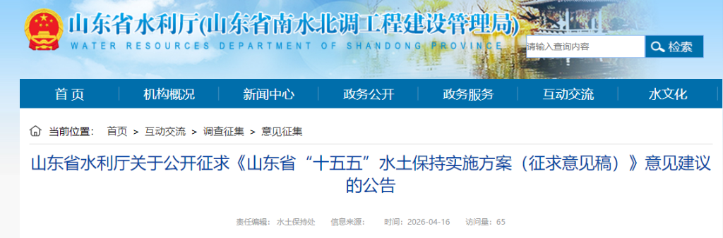 为深入贯彻《水土保持法》,全面落实新时代水土保持工作意见和《山东省水土保持规划(2016-2030年)》,推进“十五五”水土保持高质量发展。省水利厅组织起草了《山东省“十五五”水土保持实施方案(征求意见稿)》,现公开征求社会公众意见。