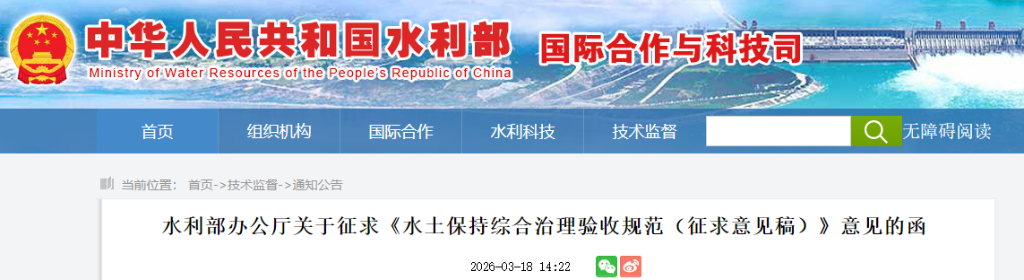 根据水利部标准制修订工作计划,由水利部水土保持司主持、水利部水土保持监测中心主编的国家标准《水土保持综合治理 验收规范》已完成征求意见稿,现征求有关单位和专家意见。请研究提出修改意见,并于2026年5月18日前将意见以纸质或电子邮件形式反馈主编单位(征求意见表见附件),逾期未反馈视为无意见。